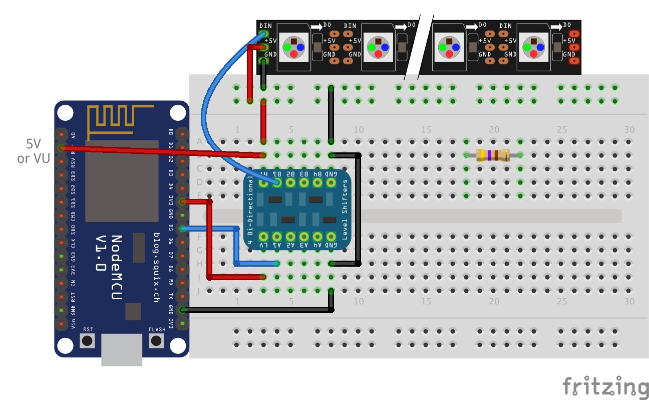 Successivamente si può utilizzare la libreria FastLed, molto più completa e versatile, anche per l'integrazione con la ESP. - Level shifter: le NeoPixel sono controllate con un segnale di controllo D0 di 5V, ricordo che la ESP genera segnali fino a 3.3V. Come risolvo?